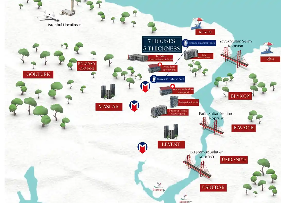 Zekeriyaköy’ün kalbinde, Belgrad Ormanı’na sadece birkaç dakika uzaklıkta ve Kilyos sahillerine komşu bir noktada konumlanan 7 House 5 Thickness, doğal güzelliklerle çevrili ayrıcalıklı bir yaşam sunuyor.